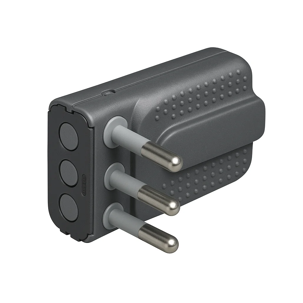 Clavija macho 10A 2P+T. Estándar de seguridad para conexiones eléctricas.