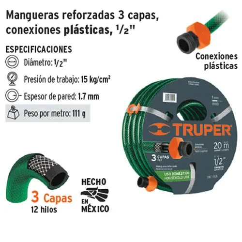 Manguera reforzada 1/2 pulgada 15 metros, 3 capas, resistente y duradera.