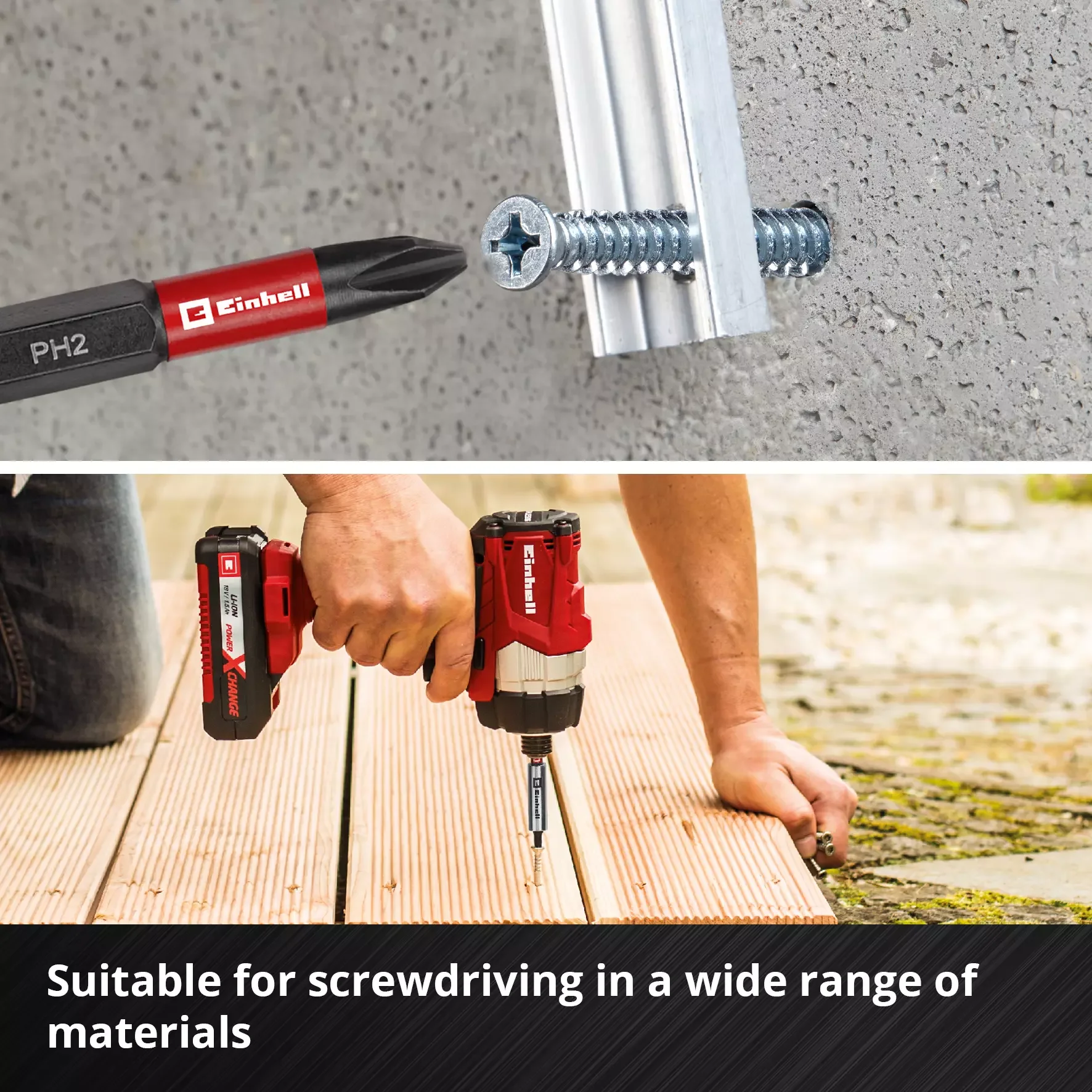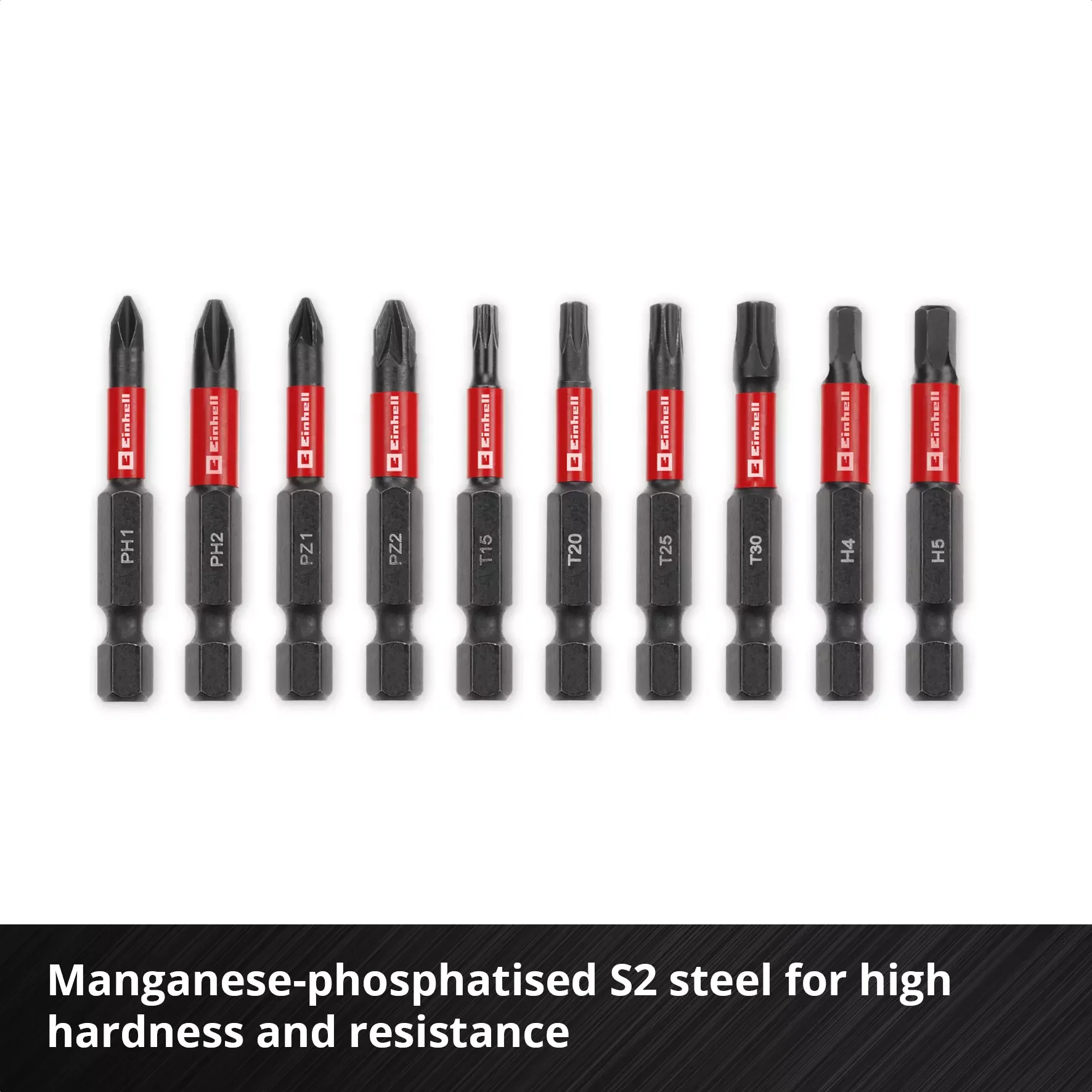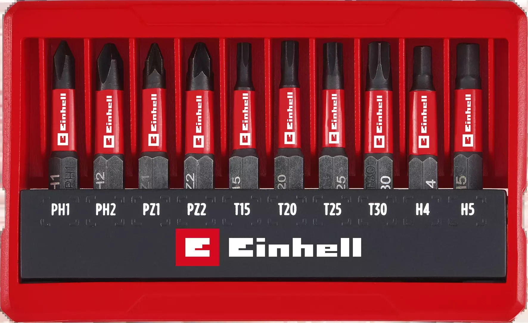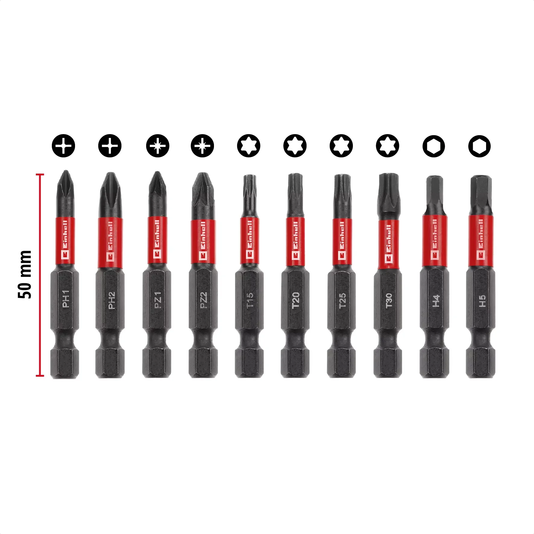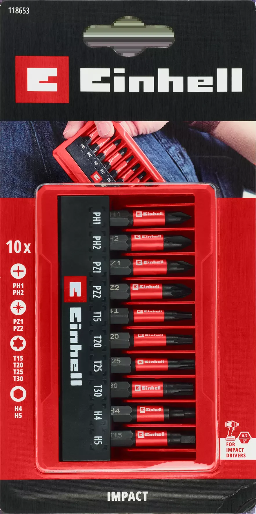 Set de 10 puntas combinadas para atornillador de impacto (modelo 49118653). Incluye puntas de 50 mm en las salidas más comunes (PH, PZ, T, H), con marcado de salida para facilitar su identificación. Fabricadas en acero S2 fosfatado, son resistentes al desgaste. Vienen en un compacto estuche tipo bolsillo, ideal para llevar y usar en casa o en trabajos profesionales.
