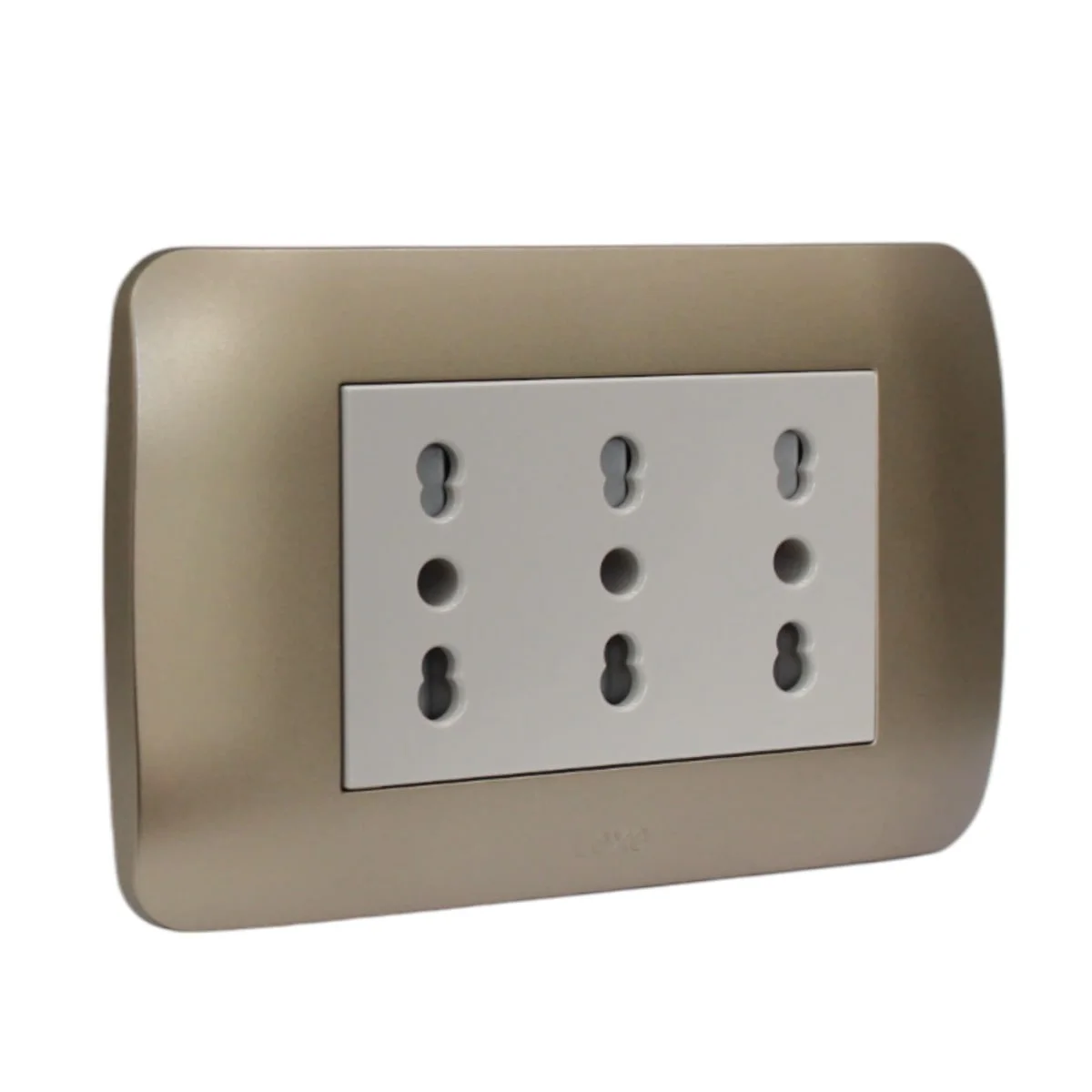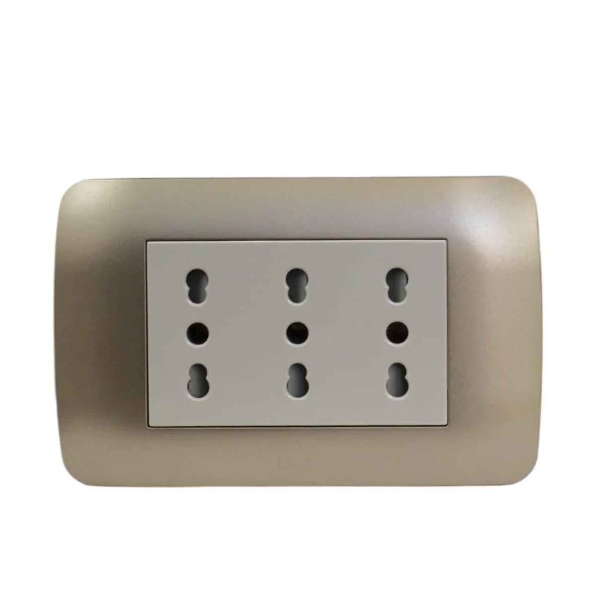 Toma triplex 10/16A beige titanio, diseño cálido y práctico.